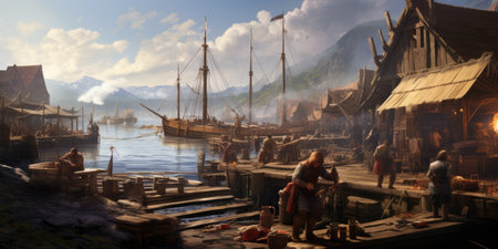 A Viking port with ships transporting goods. Busy Scandinavian wooden ship port with vikings working and trading.