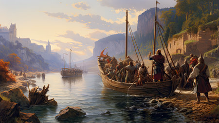 Vikings, Varangians early medieval Scandinavian seafarers in 8th and 11th centuries who made sea voyages. Swedish, Norwegian Danish. Covenanters, Assault. Occupiers Scandinavia Nordic. Generative AI.