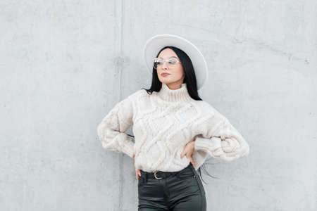 Happy beautiful young girl with fancy vintage glasses and fashionable clothes with a sweater, hat, and leather pants stands near a concrete gray wall on the street