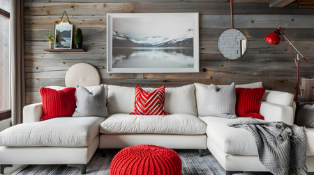 This image showcases a warm and inviting rustic-style living room with a plush,sectional sofa adorned with vibrant red and neutral-toned throw pillows The room features a stunning panoramic landscape