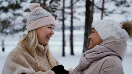 Cheerful women sharing secrets, gossiping, having fun together outdoors in winter.