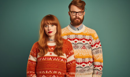 Young happy couple friends, man woman wear Christmas ugly sweater Santa hat posing spread hands isolated on plain color studio background. Happy New Year, holiday, love of the season
