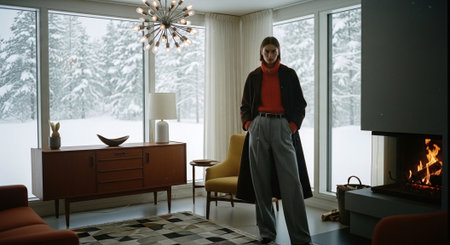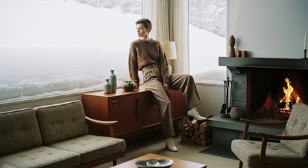 A cozy living room with large windows showing a snowy landscape outside, a woman sitting on a sofa with a cup in hand, warm lighting, and decorative plants