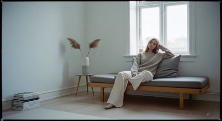 Cozy minimalist living room with scandinavian decor and neutral tones.