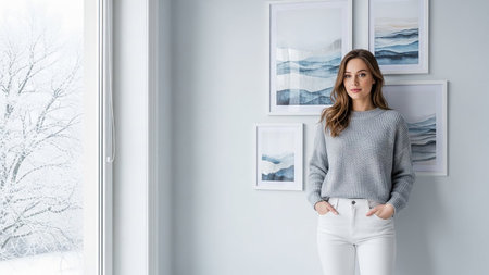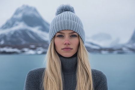 A young woman stands confidently in a gray knit sweater and beanie surrounded by stunning snowy mountains and a calm body of water. The winter landscape creates a serene backdrop.