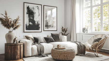 Mockup frame in interior background, room in warm tone, Scandi-Boho style, Generative AI