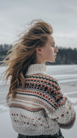 A woman with long hair is wearing a sweater with a pattern of squares and circles. She is standing on a snowy surface, looking off into the distance. Concept of solitude and contemplation