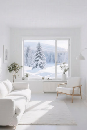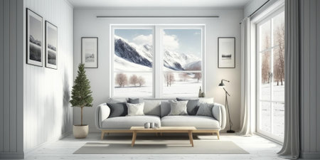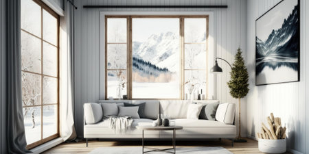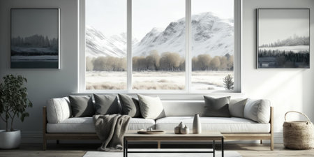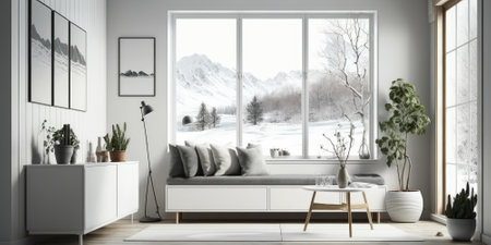White living room with sofa and winter landscape in window Scandinavian interior design