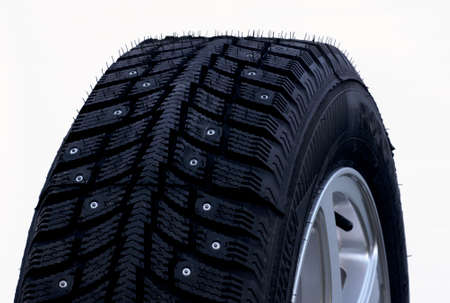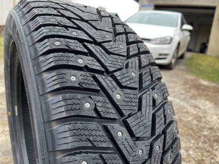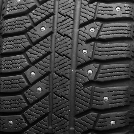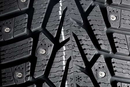 closeup of snow tire with metal studs, which improve traction on icy surfaces, studded winter tyre