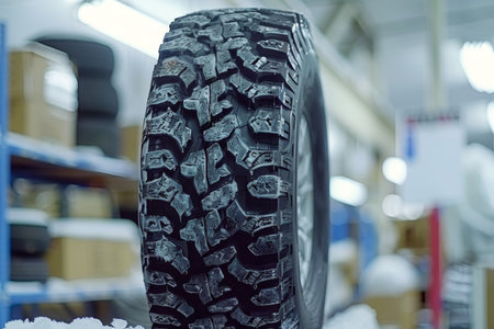 Shallow depth of field (selective focus) image with details of a dirty winter tyre in a car workshop. Sipes and cuts in the tread highlighted.