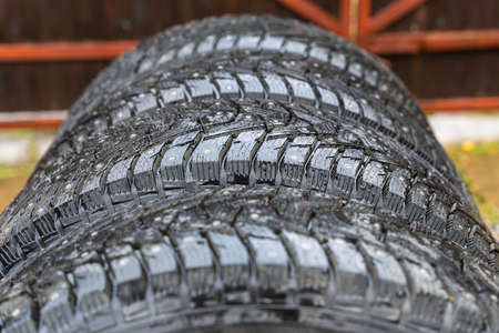 Winter tires piled on a pile close-up of a new tire tread.
