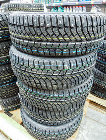 Winter vehicle tires stacked up for sale in the chain hypermarket. New studded tires for sale