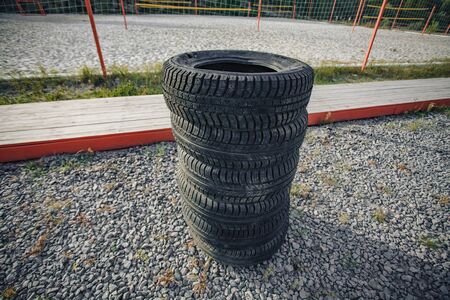 Stack of new winter tires. Group of automotive tires for snow road. Selective focus. Sale tires in shop. Safety concept.