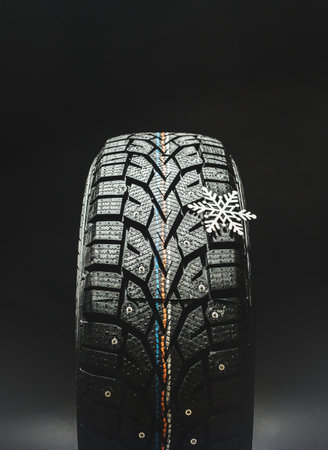 Winter tires with spikes on a black background close-up, safety during winter driving, winter tire protector, winter studded rubbe