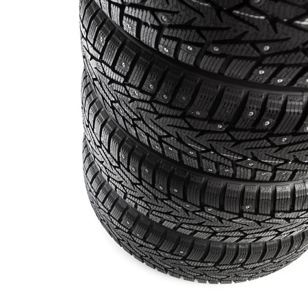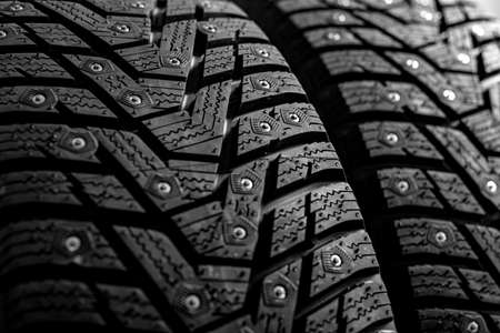 Clean new modern studded winter tires in row. Tires with spikes, close up.