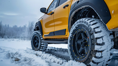 Close-up of car wheels rubber tires in winter snow. Transportation and safety concept.