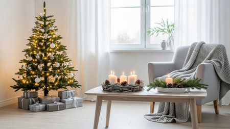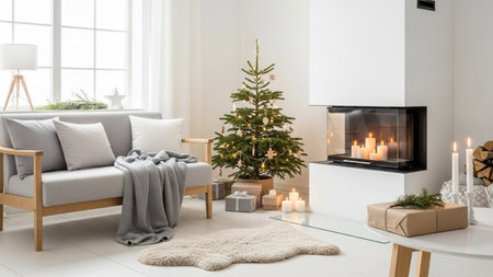 Cozy living room with Christmas tree, candles and sofa in the foreground