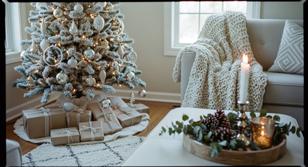 Embrace the warmth of the season with this cozy living room scene featuring a beautifully decorated Christmas tree, a festive table arrangement, and a charming ambiance.