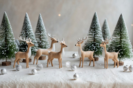 An arrangement of small reindeer figures stands among snow-covered miniature fir trees. Soft sparkling lights, snow shimmer, and white ornaments enhance the festive atmosphere.