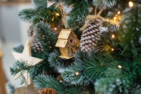 Natural wooden toys hang on the christmas tree: star, house, cone and shined Garland.