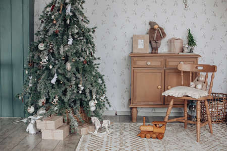 Home New Years interior. Christmas tree with gifts, decorated with garlands in the kitchen. Cozy atmosphere of a home holiday, loft design of the room, Scandinavian style.