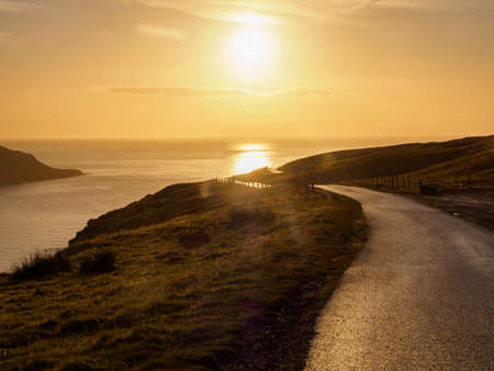 A winding road in the Faroe Islands during sunrise. The road network in the Faroe Islands is highly developed. Denmark, Northern Europe