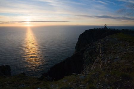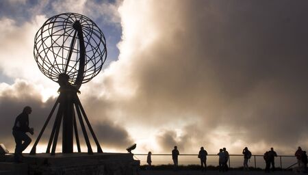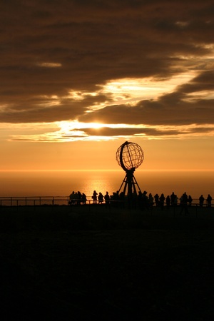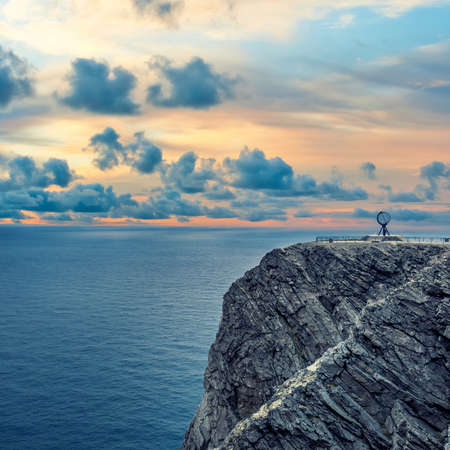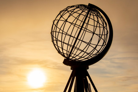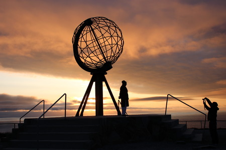 The sunset over a globe on North Cape, Nordkapp, Norway