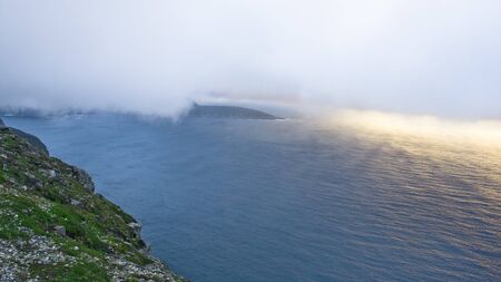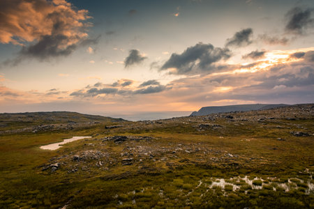 Barents sea at sunset. Rocky sea coast. Beautiful landscape, wilderness. North Cape. Nordkapp, Norway