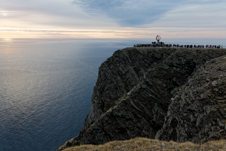 Nordakpp, Norway - June 27, 2015: People are pictured around the Norkapp monument in Norway, Europe's northernmost point.