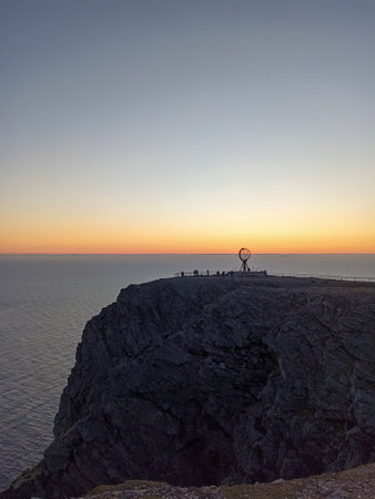 Nordkapp, Norway - June 2016: Midnight sun at North Cape Nordkapp on the northern point of Norway and Europe with Barents Sea. Nordkapp is the northernmost point in Europe that can be accessed by car