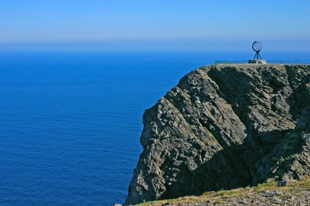 View over the world famous North Cape rock above the arctic sea with the globe sculpture on top in rare sunshine