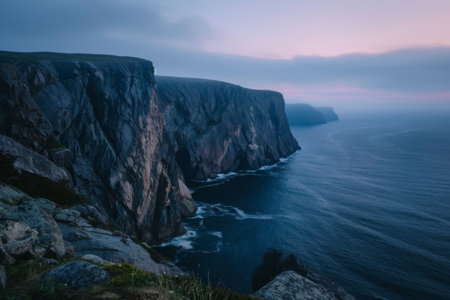 A breathtaking view of majestic cliffs overlooking a calm sea at dusk, with soft pastel skies creating a serene and dramatic scene.