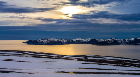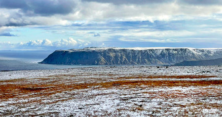 scenic view on Nordkapp (North Cape) Rocky Cliff and Tundra covered with a thin snow on the edge of the Sea of Barents