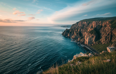 Breathtaking view of coastal cliffs during sunset with calm ocean waters and a serene sky