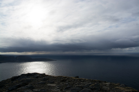 Rocky sea coast. Fjord with clougy sky. Nordkapp, Norway