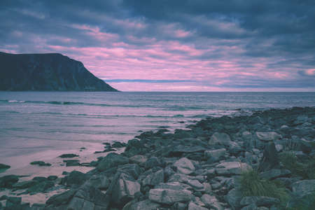 Rocky seashore with cloudy sky. Wilderness. Beautiful nature of Norway. Lofoten islands