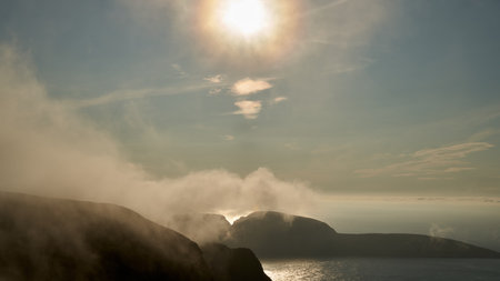 Rugged, jagged cliffs rise from the sea, illuminated by the warm, radiant glow of a setting sun. Rays of light pierce through the atmospheric haze.