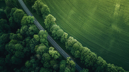 Aerial view of a curvy road through the Masurian landscape at the sunset