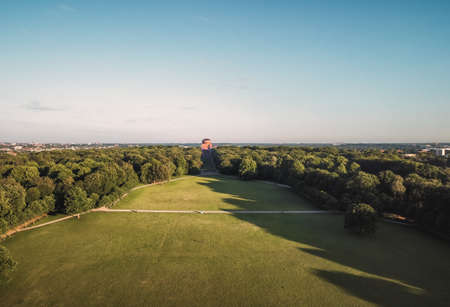 View over trees and fields and meadows in the evening sun, Essen, Germany