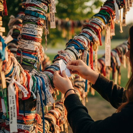 Colorful wish tags hang from vibrant bamboo, creating a peaceful scene at a Japanese temple. Visitors engage in a traditional practice of writing hopes and prayers.