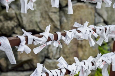 Fortune slips at Kameido Tenjin shrine in Tokyo close up