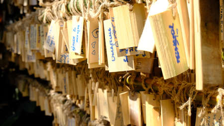 TOKYO, JAPAN - Oct 19th, 2016. Ema are small wooden plaques on which Shinto worshippers write their prayers or wishes. Ema are then left hanging up at the shrine for gods or spirits to receive them