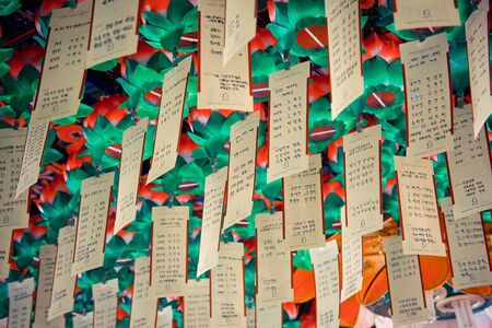 Many colorful paper strips or Tanzaku traditional custom of writing wishes on strips of colored paper, which are then hung on bamboo branches, hoping that the wish come true. Tanabata Festival. Japan.