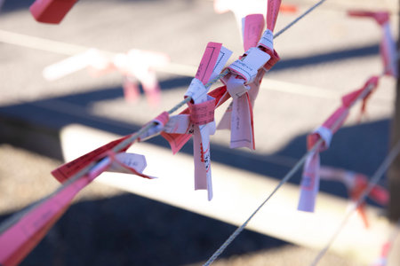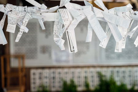 Osaka, Japan- 03 Dec, 2019: Closeup of Japanease Omikuji random fortunes paper tied to rope wire for good luck at Namba Yasaka Shrine in Osaka, Japan.