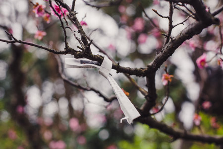 A selective focus of a paper with a message on a sakura tree branch in Osaka, Japan