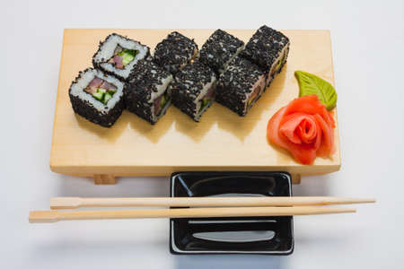 Sushi rolls on a wooden plate with chopsticks on a white background