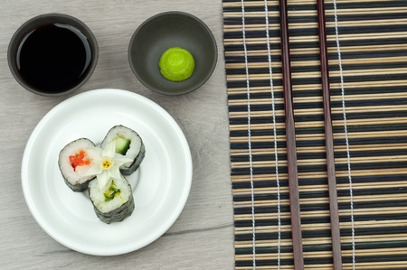 fresh sushi roll with wasabi and soya sauce on the susi roll mat and grey table.