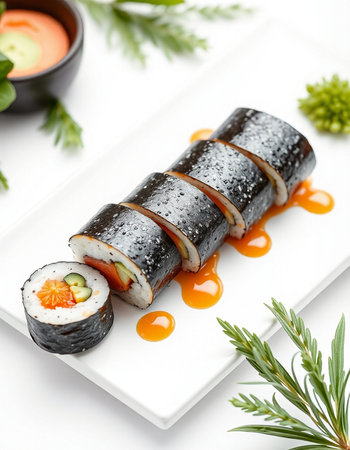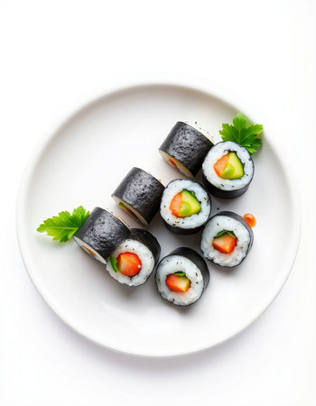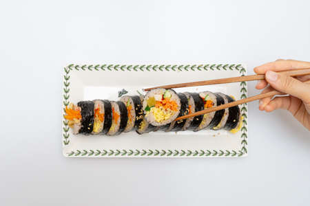traditional korean food kimbap rice roll on white table