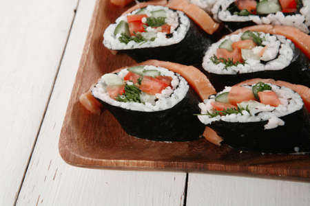 Japanese sushi - fast food. Asian traditional snack. Preparing healthy snack