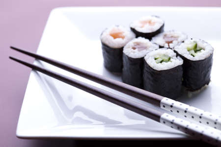 A set of traditional asian sushi rolls and wooden chopsticks